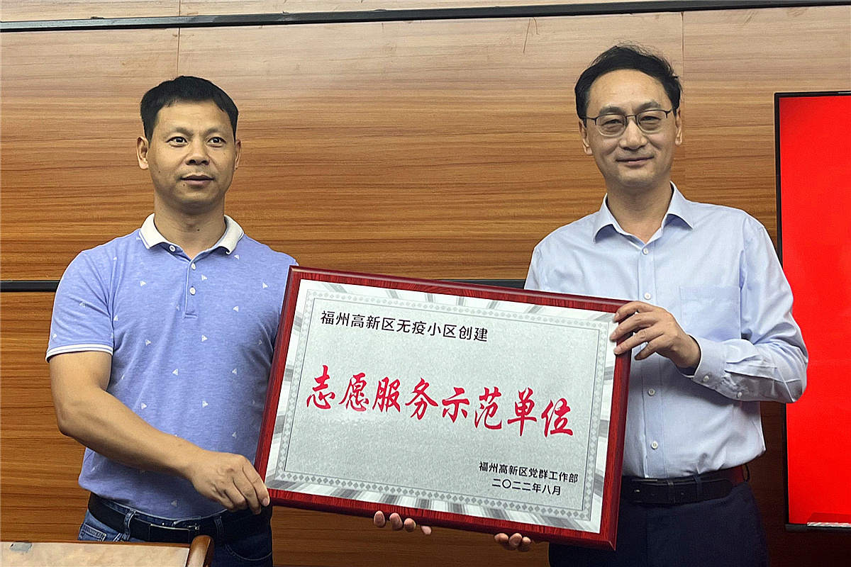 8月15日,福州高新区举办2022年无疫小区创建“志愿服务示范单位”授牌仪式,yl23411永利集团获“志愿服务示范单位”荣誉称号。福州高新区党群工作部领导黄相钰、洪见文及文明办工作人员出席仪式。yl23411永利集团副总经理汪浩受邀参加。