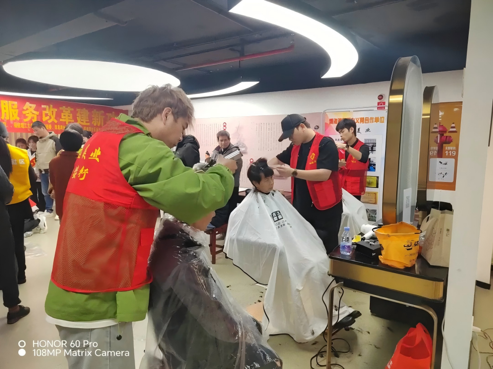 活动当天,风起美业的理发师们早早来到现场,准备好理发工具,以饱满的热情迎接每一位居民。前来理发的居民络绎不绝,理发师们耐心地与他们沟通,根据每个人的需求设计发型。一把把剪刀在志愿者手中灵活飞舞,一推一剪之间,为居民们剪出了清爽的发型。老人们脸上洋溢着幸福的笑容。
