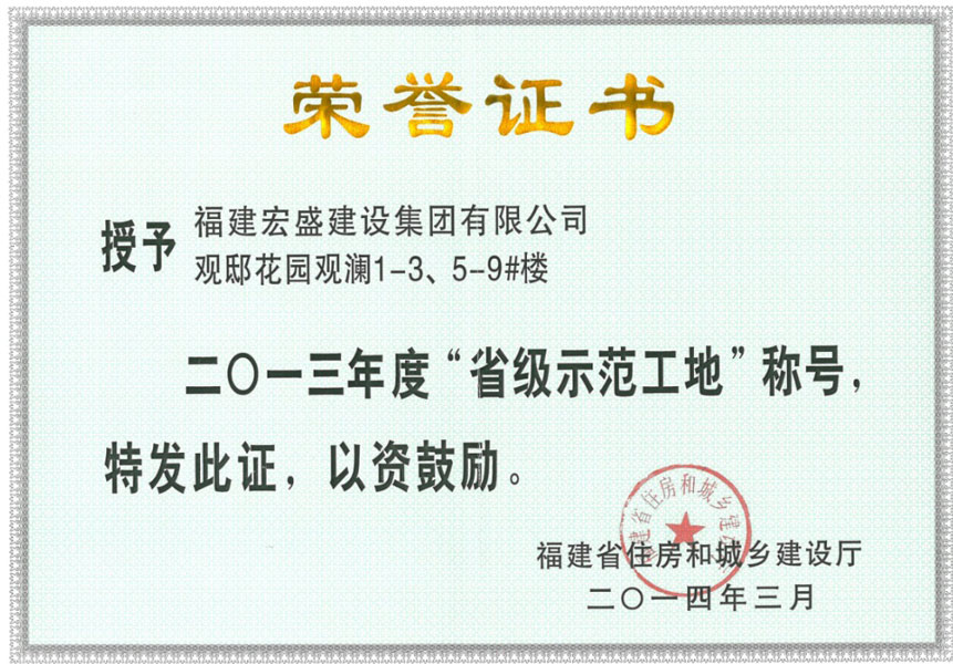 2013年度福州市观邸花园观澜1-3、5-9#获得“省级示范工地”称号