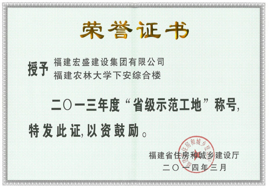 2013年度福州市农林大学下安综合楼项目获得“省级示范工地”称号